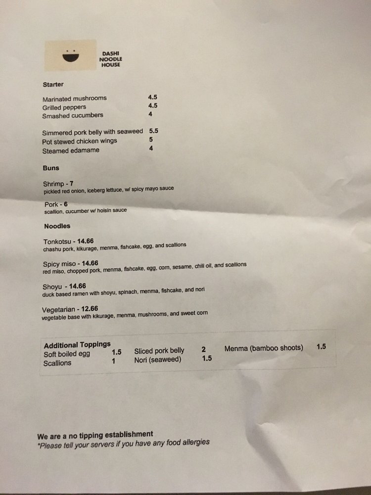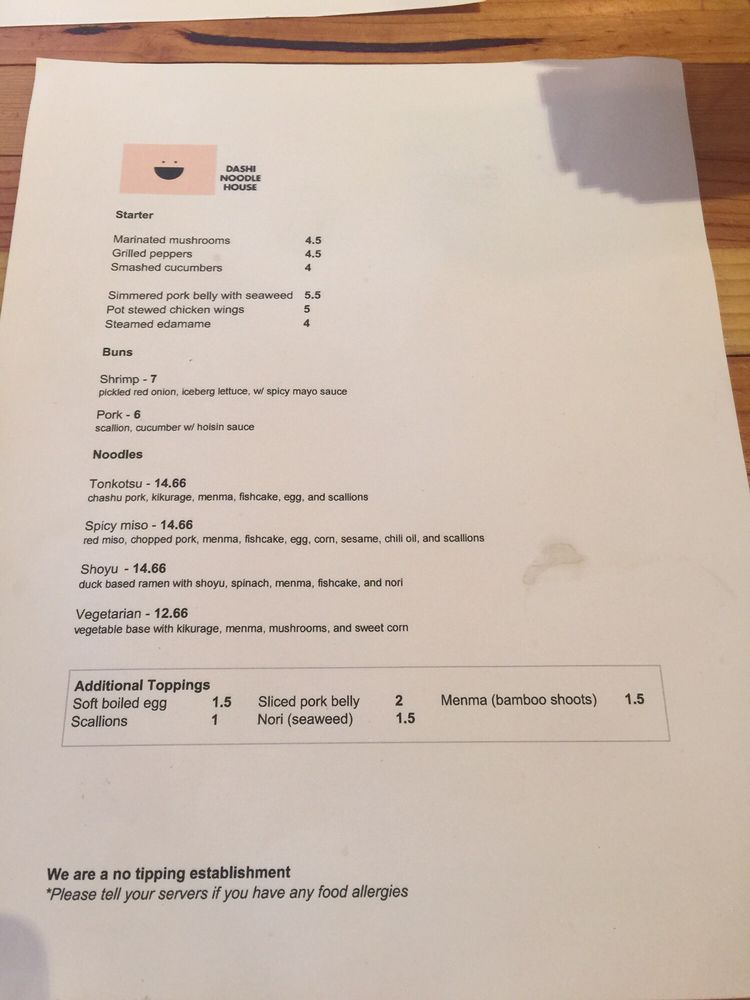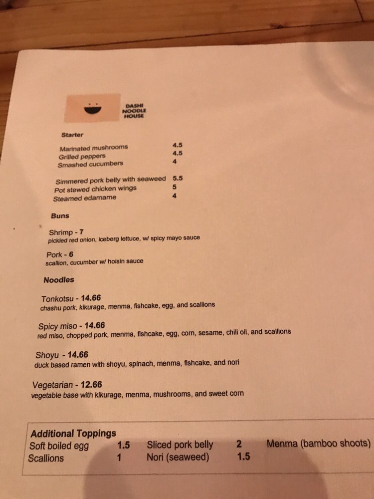 Pork and chicken broth, shoyu base, pork belly or chicken, kikurage, menma, namuru, sesame seeds, egg and scallions.